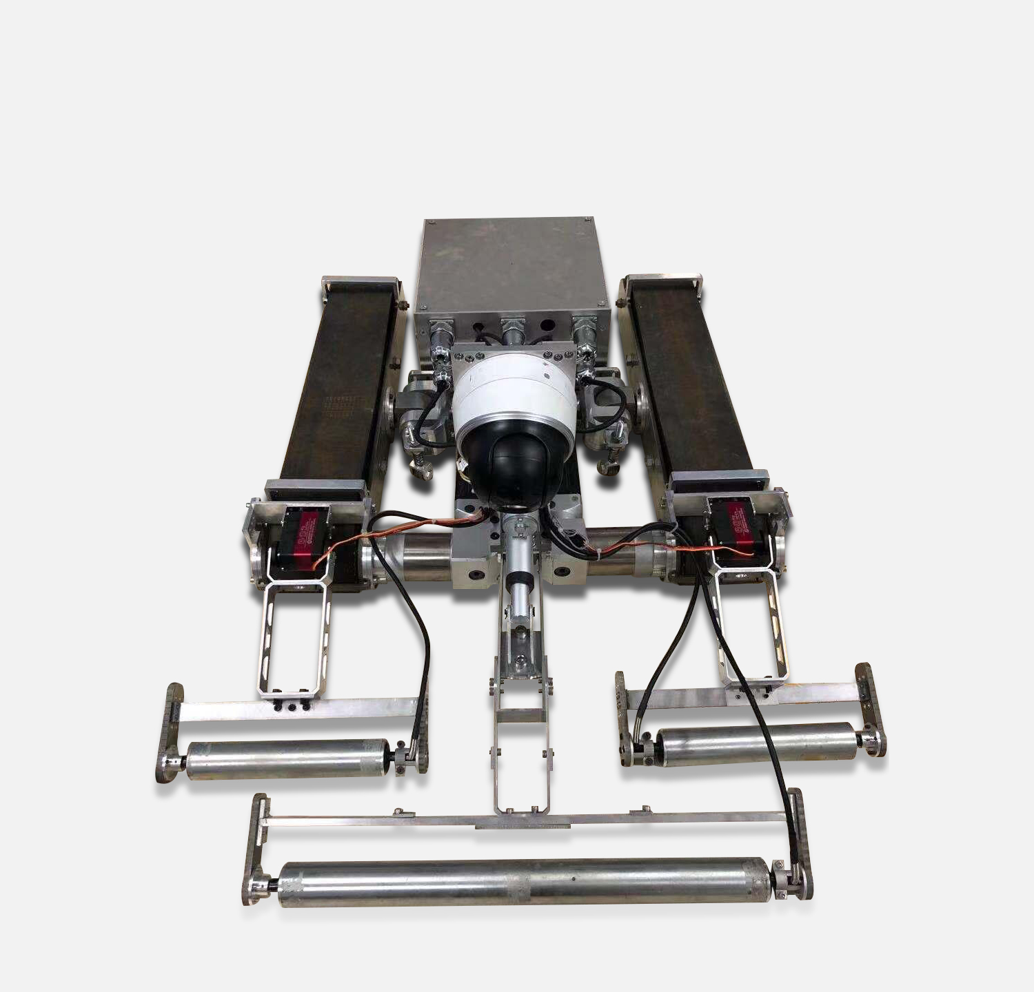 风电塔筒维护作业爬壁机器人采用间隙式永磁吸附技术,配合变曲率自适应履带移动术,可实现在类似于风电塔筒等大曲率乃至曲率多变的大型连续导磁壁面上可靠灵活运动,通过搭载高清摄像机、涡流探伤仪等无损检测设备,实现替代人工的机器人高空维护检测作业任务,解决了风电塔筒日常维护作业中作业效率与安全保障的难题。