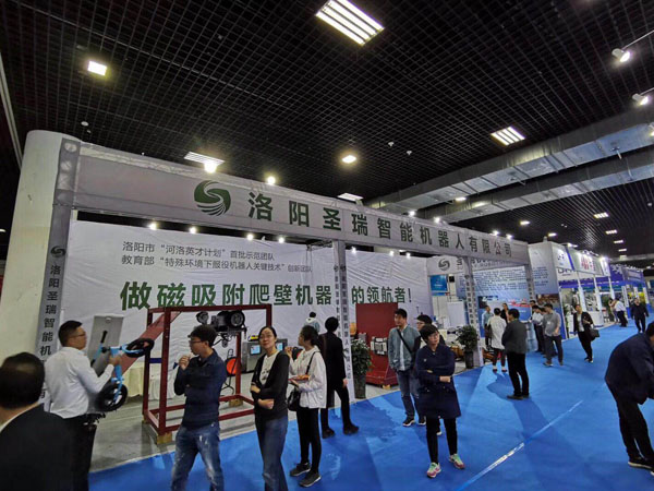 洛阳圣瑞智能机器人有限公司作为核心参展企业,公司精心组织,参展机器人规模为历届之,展示了磁力吸附爬壁机器人和应急救援机器人。磁力吸附爬壁机器人主要面向石化储罐、船舶船体、风电塔筒等大型立面的防腐及检测作业。应急救援机器人主要面向危化品企业发生泄漏、爆炸等灾害性事故后代替人工进入危险有害环境中进行信息采集和应急救援。
